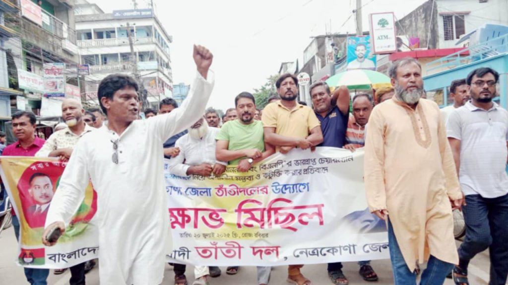 বাংলাদেশ জাতীয়তাবাদী দল (বিএনপি)-এর প্রতিষ্ঠাতা শহীদ রাষ্ট্রপতি জিয়াউর রহমান এবং দলটির ভারপ্রাপ্ত চেয়ারম্যান তারেক রহমানের প্রতি অশালীন মন্তব্য ও কটুক্তির প্রতিবাদে নেত্রকোণায় বিক্ষোভ মিছিল ও সমাবেশ করেছে জেলা জাতীয়তাবাদী তাঁতী দল।