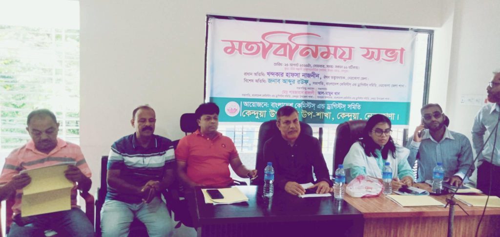 বাংলাদেশ কেমিস্টস্ এন্ড ড্রাগিস্টস্ সমিতি(বিসিডিএস),কেন্দুয়া উপজেলা শাখার আয়োজনে মতবিনিময় সভা অনুষ্ঠিত হয়েছে।সোমবার (২৫ আগস্ট)কেন্দুয়া পৌর এলাকার চিরাং মোড়ে নিউ সন্ধানী ডায়াগনস্টিক সেন্টারে সকাল ১১ ঘটিকায় উক্ত মতবিনিময় সভা অনুষ্ঠিত হয়।বিসিডিএস,কেন্দুয়া উপজেলা শাখার সভাপতি মোঃ শাহজাহান বাঙ্গালী’র সভাপতিত্বে ও সাধারণ সম্পাদক আল-মামুন খান এর সঞ্চালনায় অনুষ্ঠানে প্রধান অতিথি হিসেবে বক্তব্য প্রদান করেন নেত্রকোণা জেলার ঔষধ তত্ত্বাবধায়ক খন্দকার হাফসা নাজনীন,বিশেষ অতিথি হিসেবে বক্তব্য রাখেন বিসিডিএস,নেত্রকোণা জেলা শাখার সভাপতি আব্দুর রউফ।