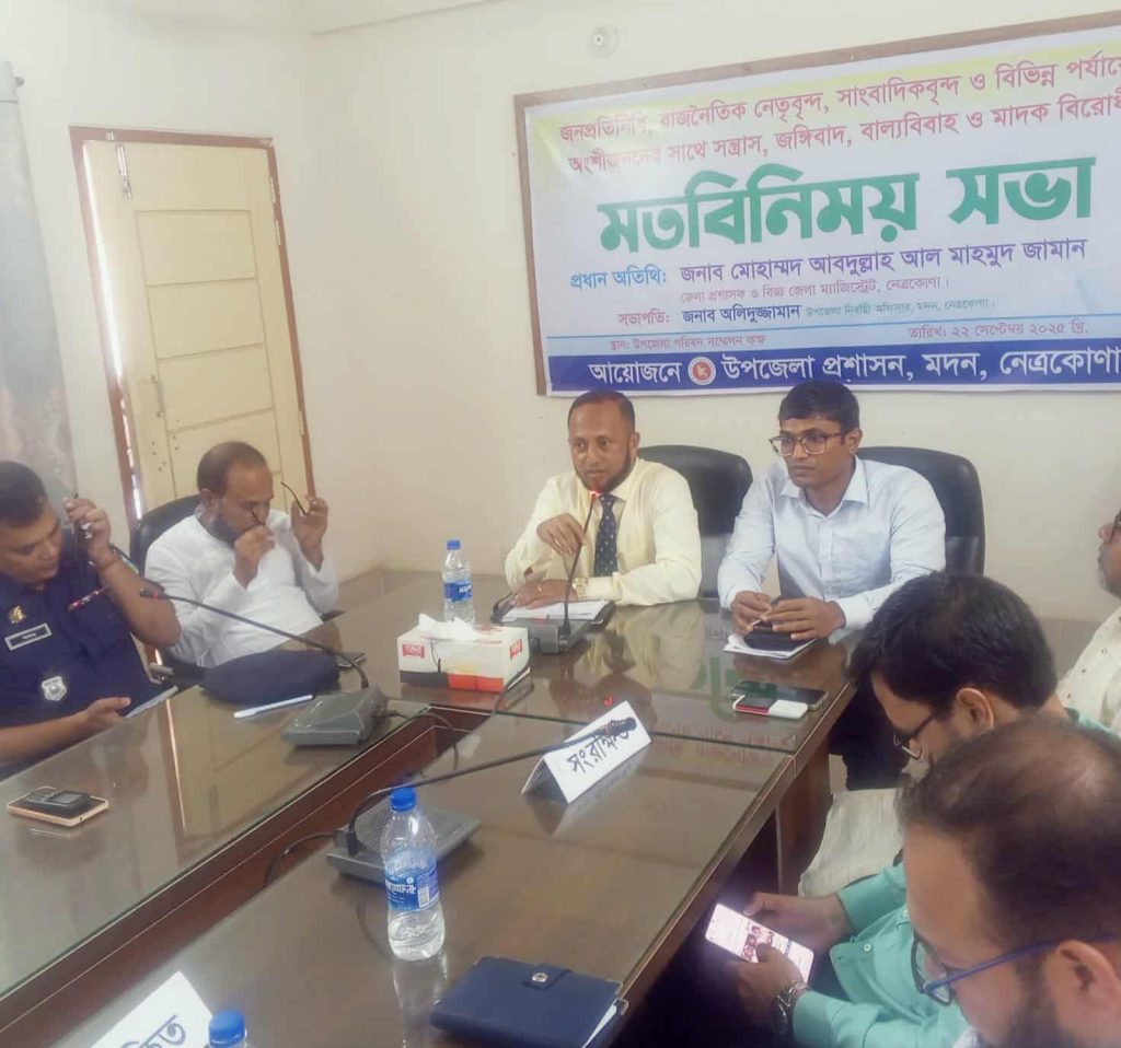 সোমবার(২২ সেপ্টেম্বর)সকালে মদন উপজেলা পরিষদ মিলনায়তনে নির্বাহী কর্মকর্তা অলিদুজ্জামানের সভাপতিত্বে- জনপ্রতিনিধি,রাজনৈতিক নেতৃবৃন্দ, সাংবাদিকবৃন্দ,বিভিন্ন পর্যায়ের ব্যক্তিবর্গের সাথে সমাজে সন্ত্রাস, জঙ্গিবাদ, বাল্যবিবাহ ও মাদক বিরোধী বিষয়ক এক মতবিনিময় সভা অনুষ্ঠিত হয়।