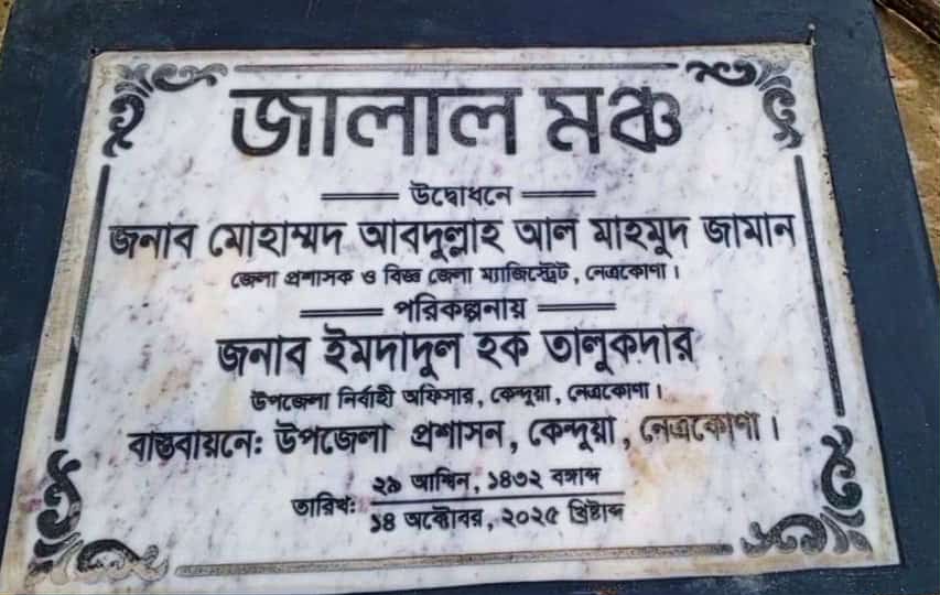 উল্লেখ্য, জালাল মঞ্চটি সম্প্রতি নির্মিত হয়ে উদ্বোধন সম্পন্ন হয়েছে। এ নিয়ে পৌরসভা ও উপজেলা প্রশাসনের মধ্যে দায়িত্ব নির্ধারণ ও ফলকের তথ্য সংশোধন নিয়ে আলোচনা চলছে।