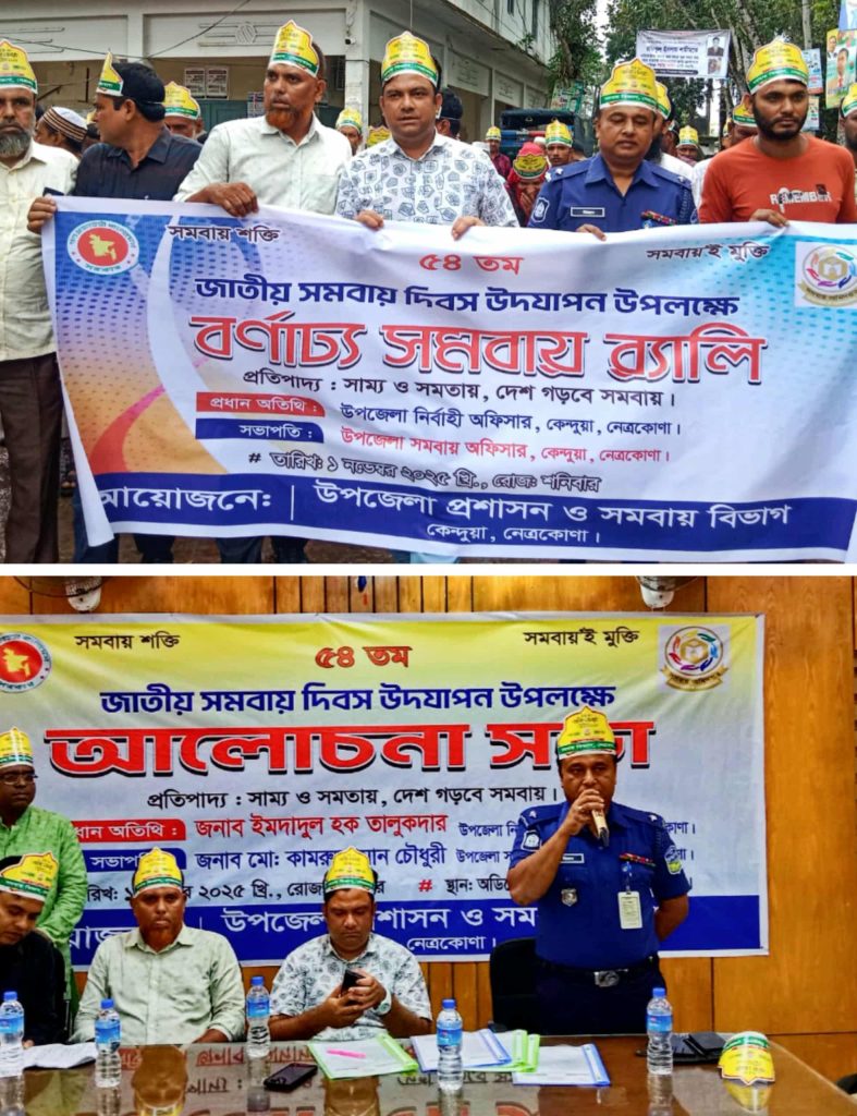 ‘সাম্য ও সমতায়,দেশ গড়বে সমবায়’প্রতিপাদ্যে নেত্রকোণার কেন্দুয়ায় ৫৪তম জাতীয় সমবায় দিবস উদযাপন উপলক্ষে পতাকা উত্তোলন,বর্ণাঢ্য র্যালী ও আলোচনা সভা অনুষ্ঠিত হয়েছে।