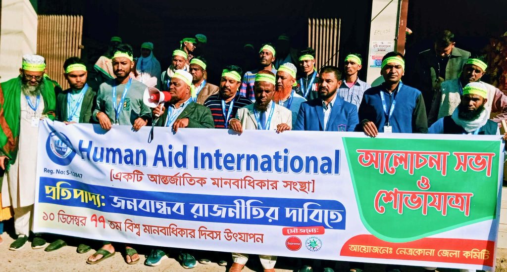 ৭৭ তম বিশ্ব মানবাধিকার দিবস উপলক্ষে আন্তর্জাতিক মানবাধিকার সংস্থা হিউম্যান এইড ইন্টারন্যাশনাল-এর নেত্রকোণা জেলা কমিটির আয়োজনে আলোচনা সভা ও শোভাযাত্রা অনুষ্ঠিত হয়েছে।জনবান্ধব রাজনীতির দাবি” প্রতিপাদ্যকে সামনে রেখে এবারের ৭৭তম বিশ্ব মানবাধিকার দিবস উদ্যাপন করেছে হিউম্যান এইড ইন্টারন্যাশনাল।