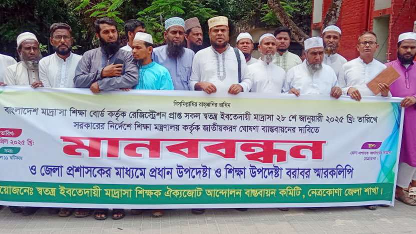 বাংলাদেশ মাদ্রাসা শিক্ষা বোর্ড কর্তৃক রেজিস্ট্রেশন প্রাপ্ত সকল স্বতন্ত্র ইবতেদায়ী মাদ্রাসা গত ২৮ জানুয়ারী ২০২৫ তারিখে সরকারের নির্দেশে শিক্ষা মন্ত্রণালয় কর্তৃক জাতীয়করণ ঘোষণা বাস্তবায়ন ও ৬ দফার দাবিতে নেত্রকোণায় জেলা প্রশাসক কার্যালয়ের সামনে রবিবার(২০/০৪/২০২৫) ঘণ্টা ব্যাপী শতাধিক শিক্ষক -শিক্ষিকার অংশগ্রহণে মানব-বন্ধন অনুষ্ঠিত হয়। পরে জেলা প্রশাসকের মাধ্যমে প্রধান উপদেষ্টা ও শিক্ষা উপদেষ্টা বরাবরে স্বারকলিপি প্রদান করে নেত্রকোণা জেলা শাখার স্বতন্ত্র ইবতেদায়ী মাদ্রাসা শিক্ষক ঐক্যজোট আন্দোলন বাস্তবায়ন কমিটি।